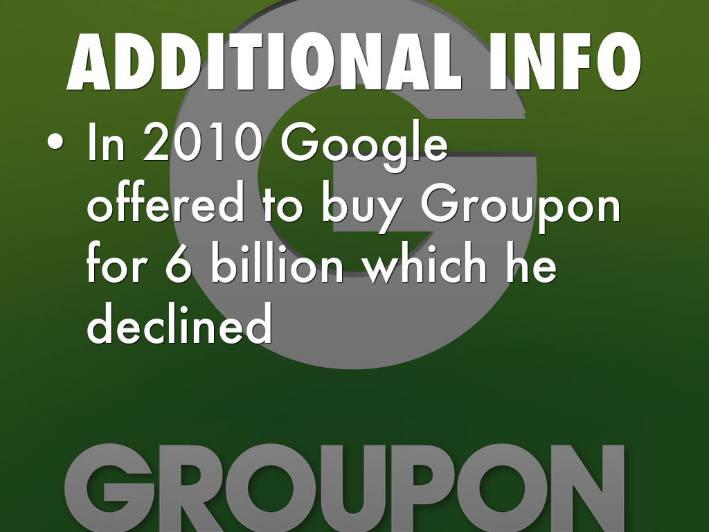 In 2010 Google offered to buy Groupon for 6 billion which he declined