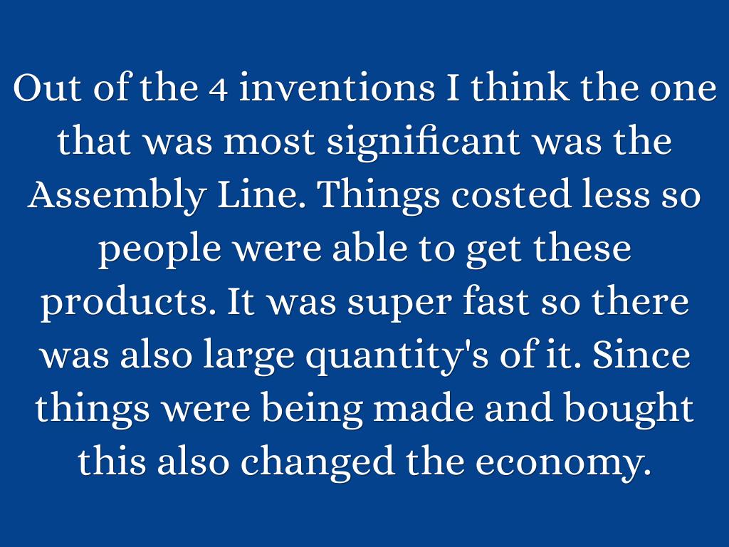 Out of the 4 inventions I think the one that was most significant was the Assembly Line. Things costed less so people were able to get these products. It was super fast so there was also large quantity's of it. Since things were being made and bought this also changed the economy.
