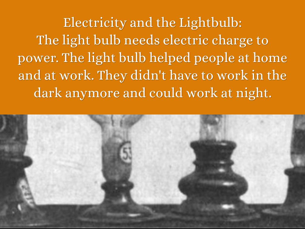 The light bulb needs electric charge to power. The light bulb helped people at home and at work. They didn't have to work in the dark anymore and could work at night.