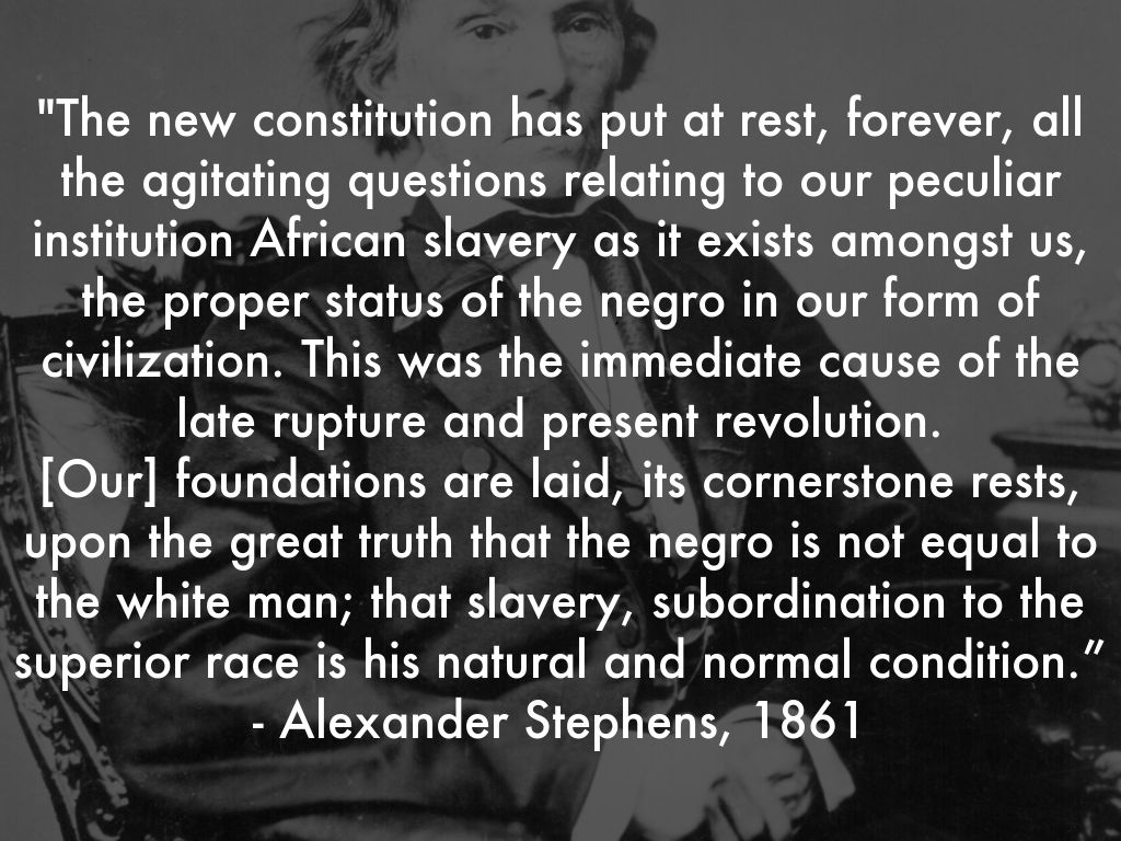 "The new constitution has put at rest, forever, all the agitating questions relating to our peculiar institution African slavery as it exists amongst us, the proper status of the negro in our form of civilization. This was the immediate cause of the late rupture and present revolution.