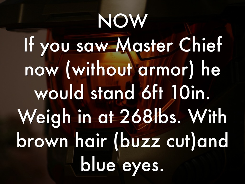 If you saw Master Chief now (without armor) he would stand 6ft 10in. Weigh in at 268lbs. With brown hair (buzz cut)and blue eyes.