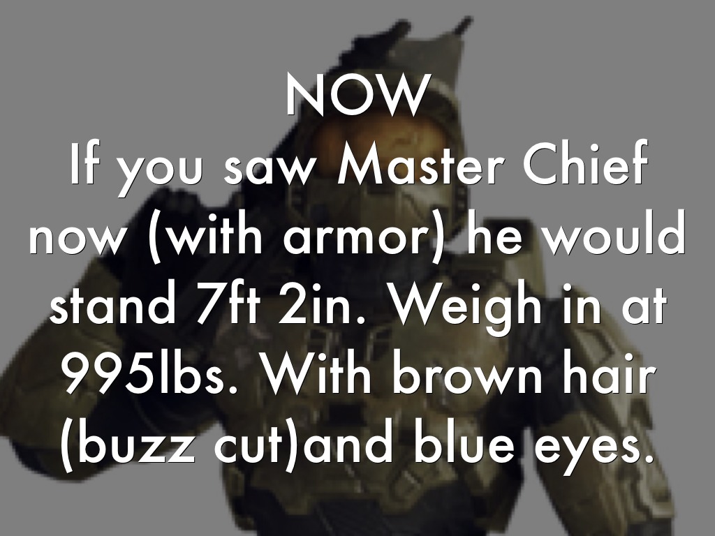 If you saw Master Chief now (with armor) he would stand 7ft 2in. Weigh in at 995lbs. With brown hair (buzz cut)and blue eyes.