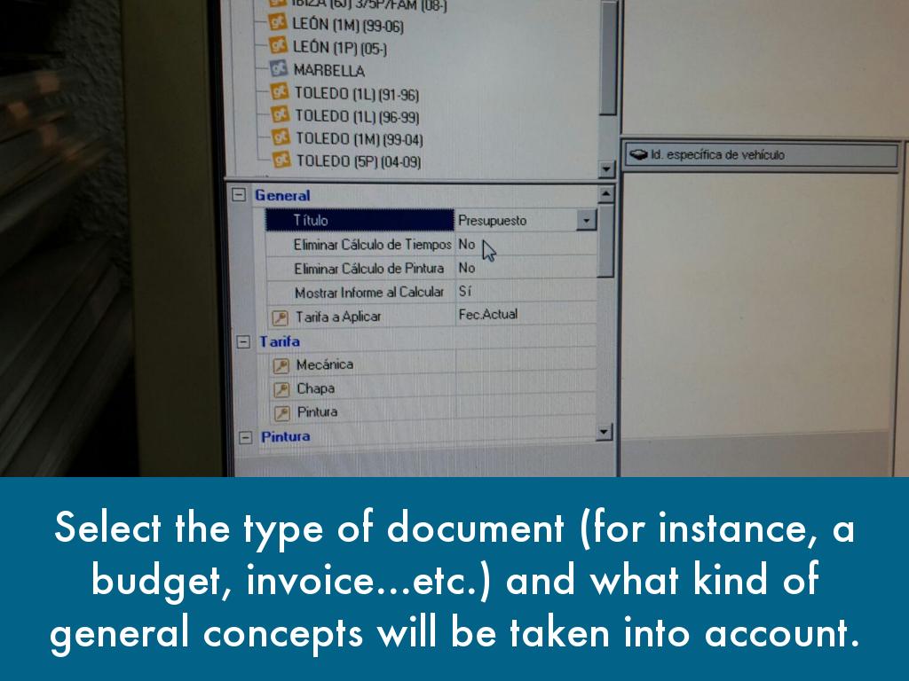 Select the type of document (for instance, a budget, invoice...etc.) and what kind of general concepts will be taken into account.