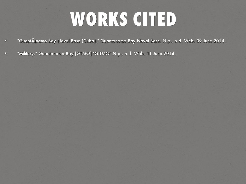 - "Guantánamo Bay Naval Base (Cuba)." Guantanamo Bay Naval Base. N.p., n.d. Web. 09 June 2014.