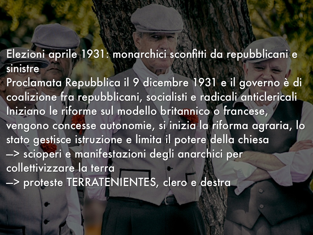 Elezioni aprile 1931: monarchici sconfitti da repubblicani e sinistre Proclamata Repubblica il 9 dicembre 1931 e il governo è di coalizione fra repubblicani, socialisti e radicali anticlericali Iniziano le riforme sul modello britannico o francese, vengono concesse autonomie, si inizia la riforma agraria, lo stato gestisce istruzione e limita il potere della chiesa ---> scioperi e manifestazioni degli anarchici per collettivizzare la terra ---> proteste TERRATENIENTES, clero e destra