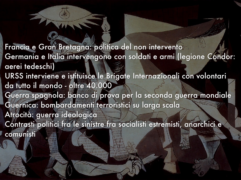 Francia e Gran Bretagna: politica del non intervento Germania e Italia intervengono con soldati e armi (legione Condor: aerei tedeschi) URSS interviene e istituisce le Brigate Internazionali con volontari da tutto il mondo - oltre 40.000 Guerra spagnola: banco di prova per la seconda guerra mondiale Guernica: bombardamenti terroristici su larga scala Atrocità: guerra ideologica Contrasti politici fra le sinistre fra socialisti estremisti, anarchici e comunisti