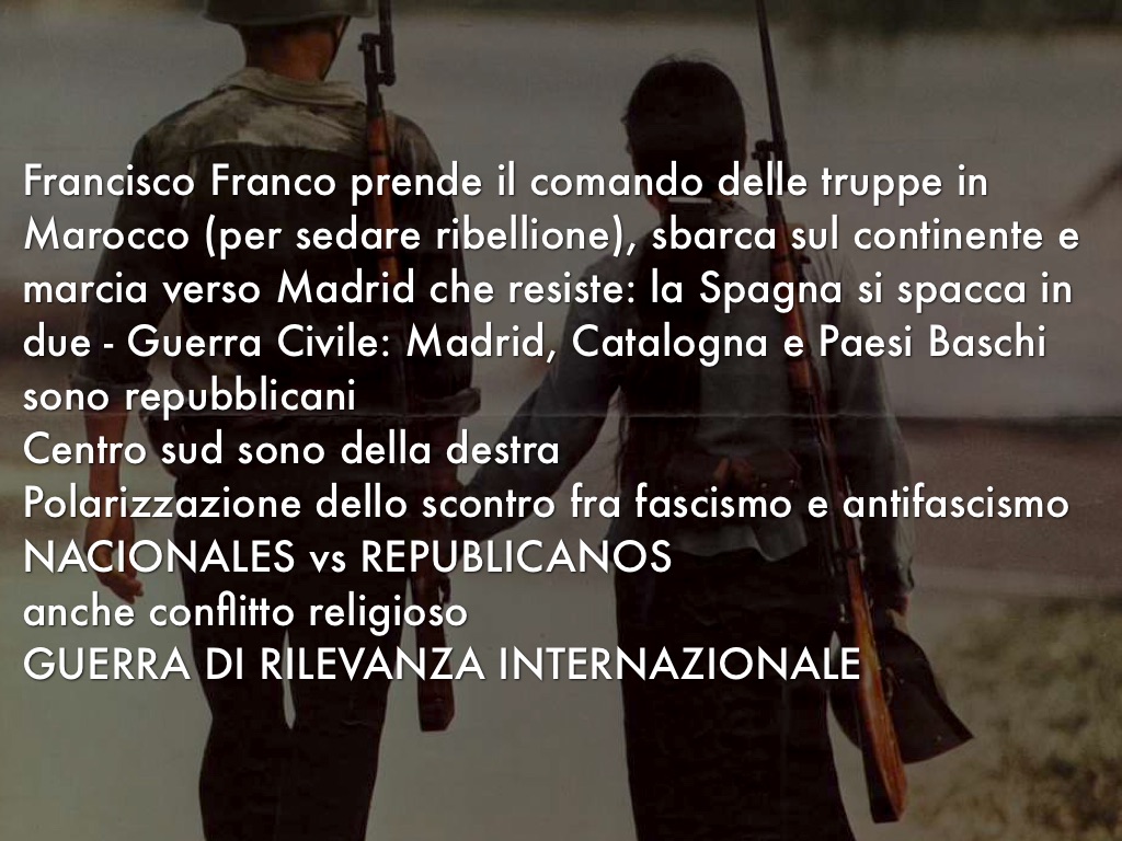 Francisco Franco prende il comando delle truppe in Marocco (per sedare ribellione), sbarca sul continente e marcia verso Madrid che resiste: la Spagna si spacca in due - Guerra Civile: Madrid, Catalogna e Paesi Baschi sono repubblicani Centro sud sono della destra Polarizzazione dello scontro fra fascismo e antifascismo NACIONALES vs REPUBLICANOS anche conflitto religioso GUERRA DI RILEVANZA INTERNAZIONALE