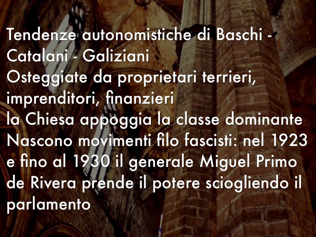 Tendenze autonomistiche di Baschi - Catalani - Galiziani Osteggiate da proprietari terrieri, imprenditori, finanzieri la Chiesa appoggia la classe dominante Nascono movimenti filo fascisti: nel 1923 e fino al 1930 il generale Miguel Primo de Rivera prende il potere sciogliendo il parlamento