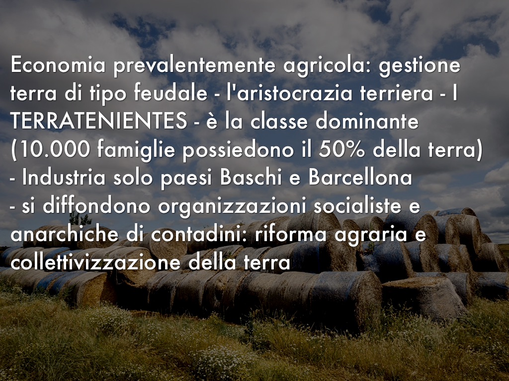 Economia prevalentemente agricola: gestione terra di tipo feudale - l'aristocrazia terriera - I TERRATENIENTES - è la classe dominante (10.000 famiglie possiedono il 50% della terra) - Industria solo paesi Baschi e Barcellona - si diffondono organizzazioni socialiste e anarchiche di contadini: riforma agraria e collettivizzazione della terra