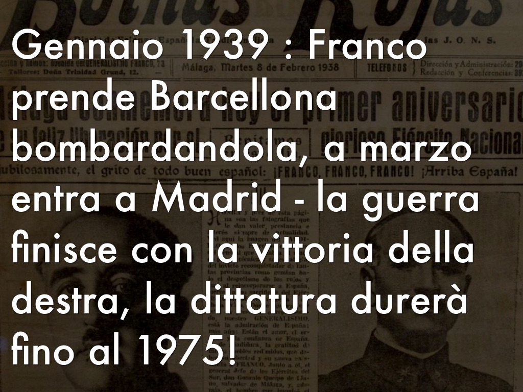 Gennaio 1939 : Franco prende Barcellona bombardandola, a marzo entra a Madrid - la guerra finisce con la vittoria della destra, la dittatura durerà fino al 1975!