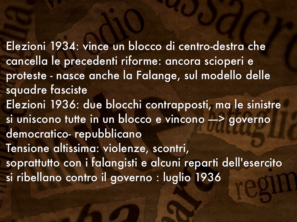 Elezioni 1934: vince un blocco di centro-destra che cancella le precedenti riforme: ancora scioperi e proteste - nasce anche la Falange, sul modello delle squadre fasciste Elezioni 1936: due blocchi contrapposti, ma le sinistre si uniscono tutte in un blocco e vincono ----> governo democratico- repubblicano Tensione altissima: violenze, scontri, soprattutto con i falangisti e alcuni reparti dell'esercito si ribellano contro il governo : luglio 1936