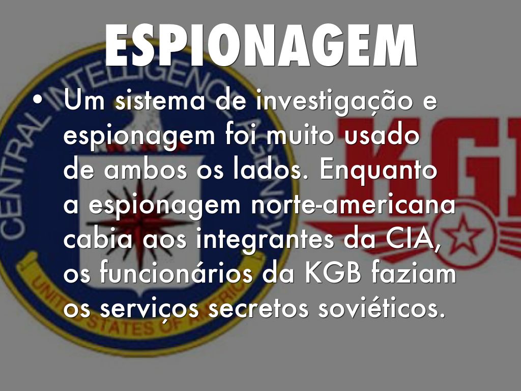 Um sistema de investigação e espionagem foi muito usado de ambos os lados. Enquanto a espionagem norte-americana cabia aos integrantes da CIA, os funcionários da KGB faziam os serviços secretos soviéticos.