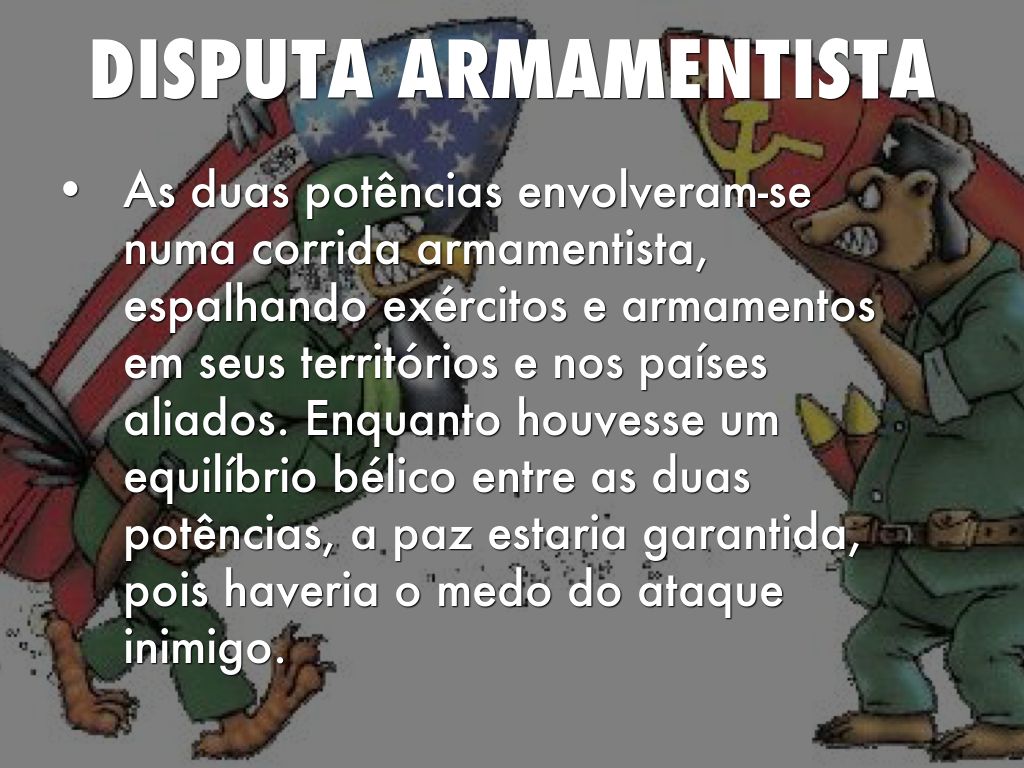 As duas potências envolveram-se numa corrida armamentista, espalhando exércitos e armamentos em seus territórios e nos países aliados. Enquanto houvesse um equilíbrio bélico entre as duas potências, a paz estaria garantida, pois haveria o medo do ataque inimigo.