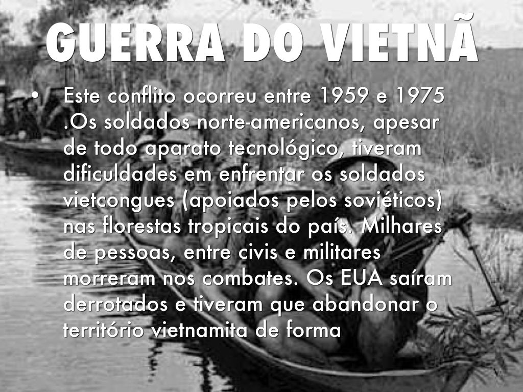 Este conflito ocorreu entre 1959 e 1975 .Os soldados norte-americanos, apesar de todo aparato tecnológico, tiveram dificuldades em enfrentar os soldados vietcongues (apoiados pelos soviéticos) nas florestas tropicais do país. Milhares de pessoas, entre civis e militares morreram nos combates. Os EUA saíram derrotados e tiveram que abandonar o território vietnamita de forma vergonhosa em 1975. O Vietnã passou a ser socialista.