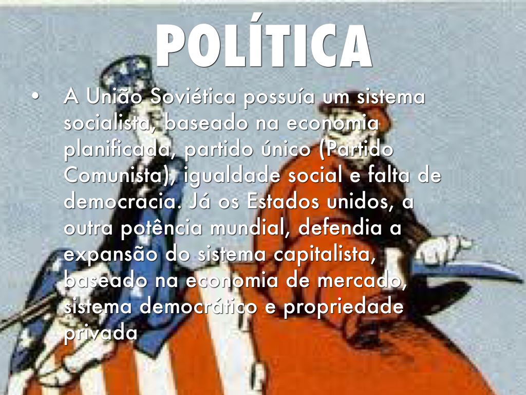 A União Soviética possuía um sistema socialista, baseado na economia planificada, partido único (Partido Comunista), igualdade social e falta de democracia. Já os Estados unidos, a outra potência mundial, defendia a expansão do sistema capitalista, baseado na economia de mercado, sistema democrático e propriedade privada