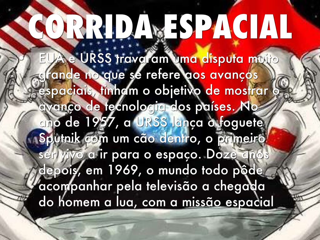 EUA e URSS travaram uma disputa muito grande no que se refere aos avanços espaciais, tinham o objetivo de mostrar o avanço de tecnologia dos países. No ano de 1957, a URSS lança o foguete Sputnik com um cão dentro, o primeiro ser vivo a ir para o espaço. Doze anos depois, em 1969, o mundo todo pôde acompanhar pela televisão a chegada do homem a lua, com a missão espacial norte-o americana.