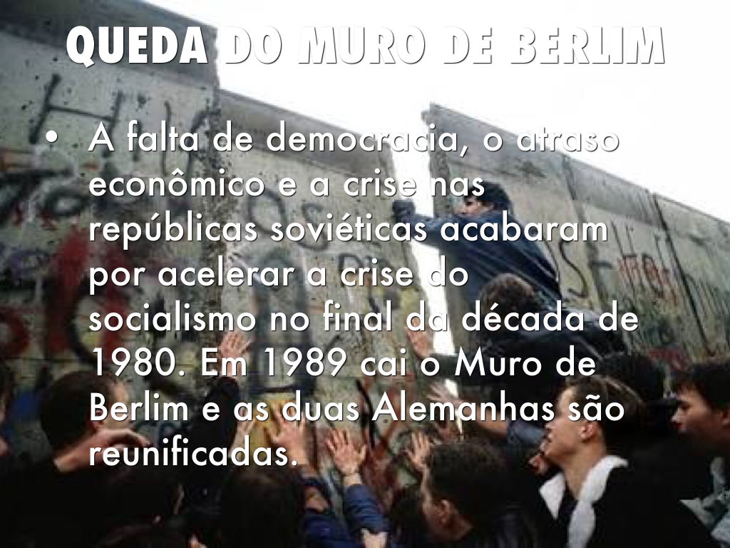 A falta de democracia, o atraso econômico e a crise nas repúblicas soviéticas acabaram por acelerar a crise do socialismo no final da década de 1980. Em 1989 cai o Muro de Berlim e as duas Alemanhas são reunificadas.