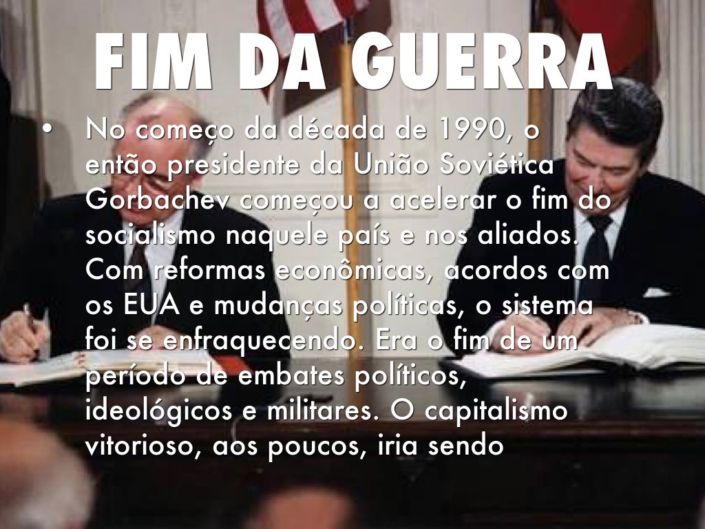 No começo da década de 1990, o então presidente da União Soviética Gorbachev começou a acelerar o fim do socialismo naquele país e nos aliados. Com reformas econômicas, acordos com os EUA e mudanças políticas, o sistema foi se enfraquecendo. Era o fim de um período de embates políticos, ideológicos e militares. O capitalismo vitorioso, aos poucos, iria sendo implantado nos países socialistas.