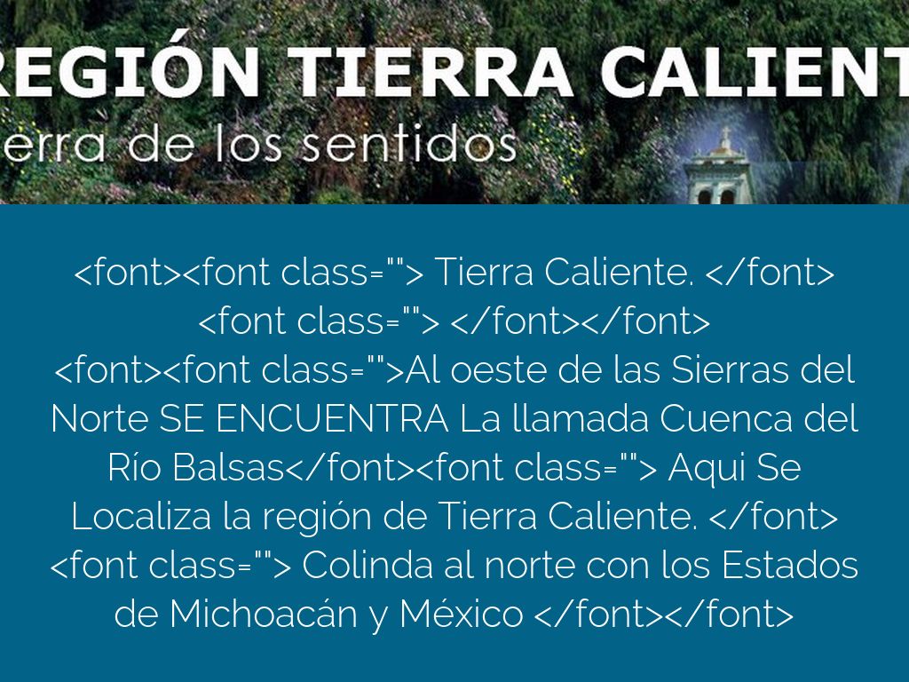 Al oeste de las Sierras del Norte SE ENCUENTRA La llamada Cuenca del Río Balsas Aqui Se Localiza la región de Tierra Caliente. Colinda al norte con los Estados de Michoacán y México