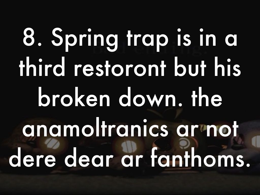8. Spring trap is in a third restoront but his broken down. the anamoltranics ar not dere dear ar fanthoms.