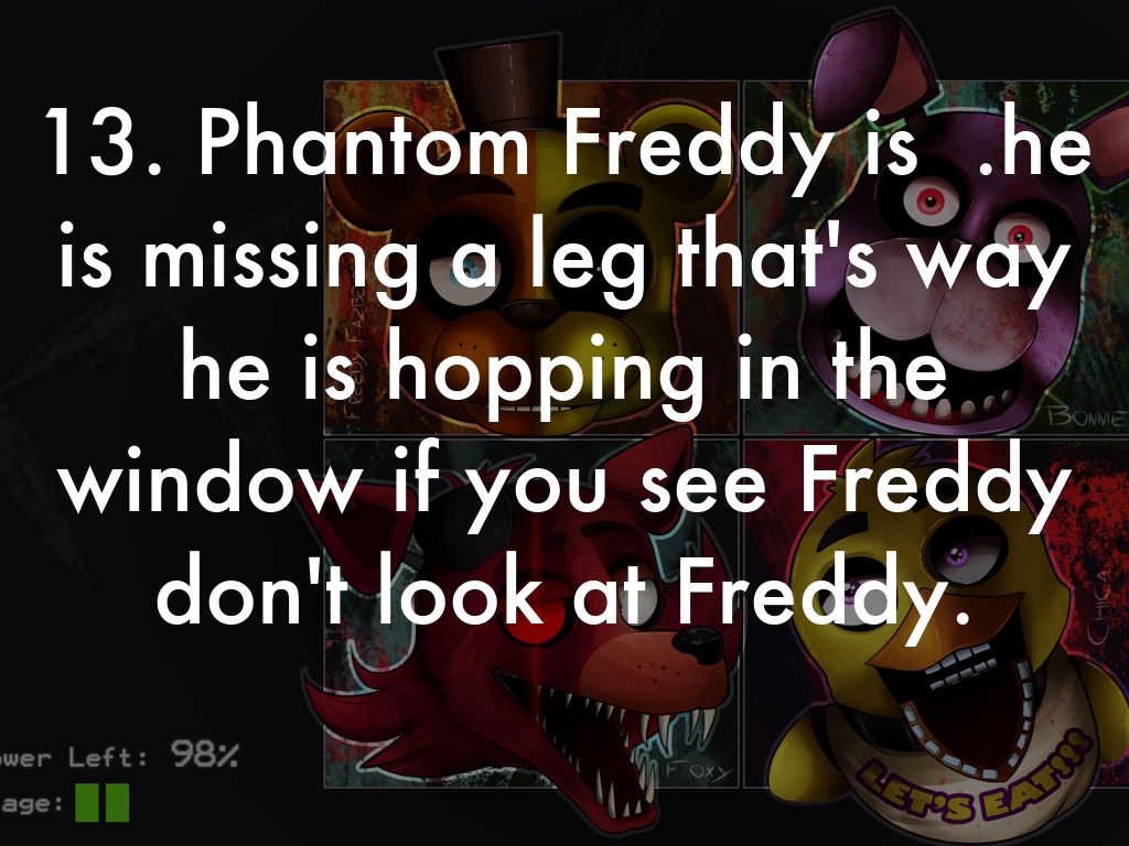 13. Phantom Freddy is .he is missing a leg that's way he is hopping in the window if you see Freddy don't look at Freddy.