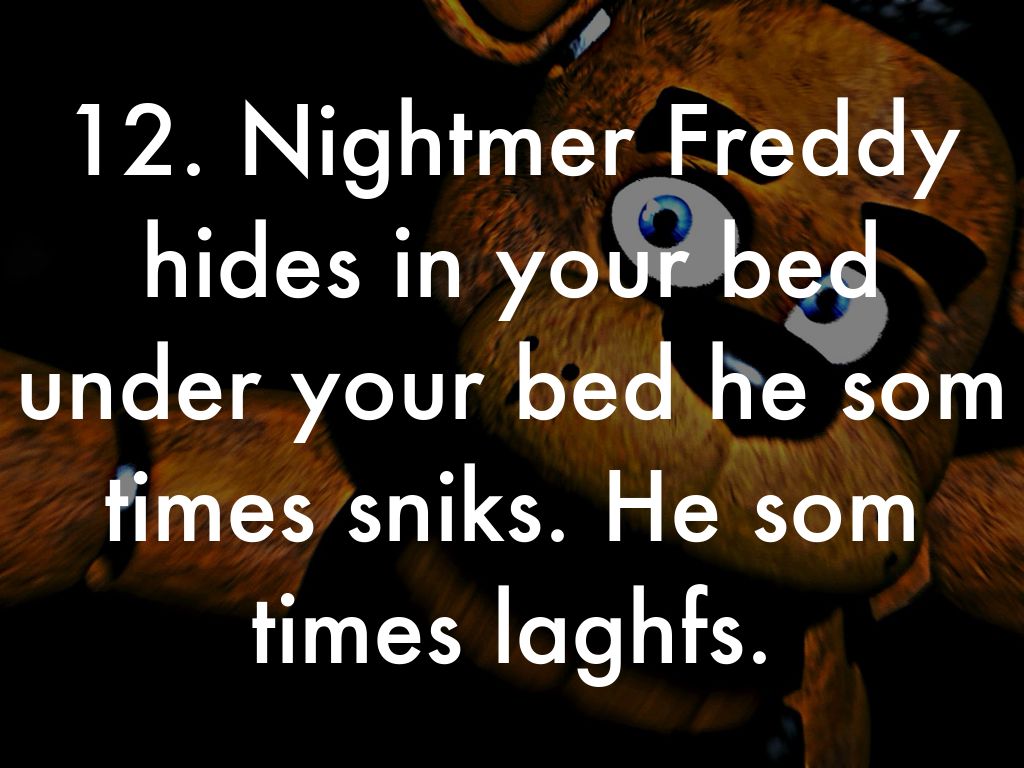 12. Nightmer Freddy hides in your bed under your bed he som times sniks. He som times laghfs.