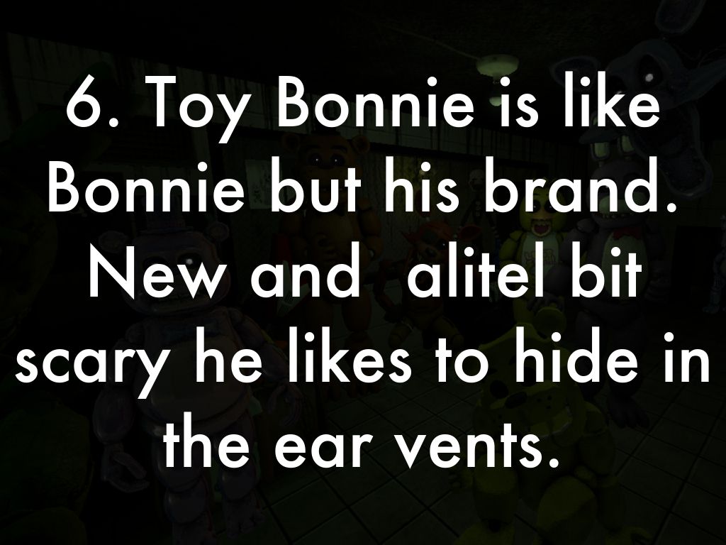 6. Toy Bonnie is like Bonnie but his brand. New and alitel bit scary he likes to hide in the ear vents.