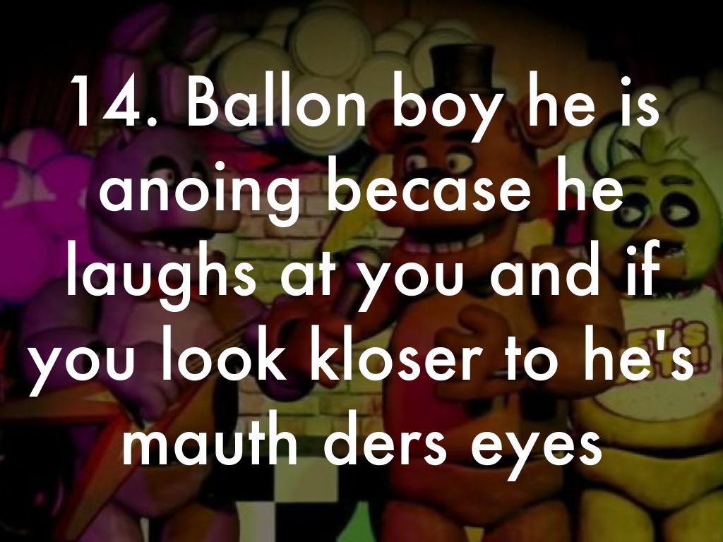 14. Ballon boy he is anoing becase he laughs at you and if you look kloser to he's mauth ders eyes