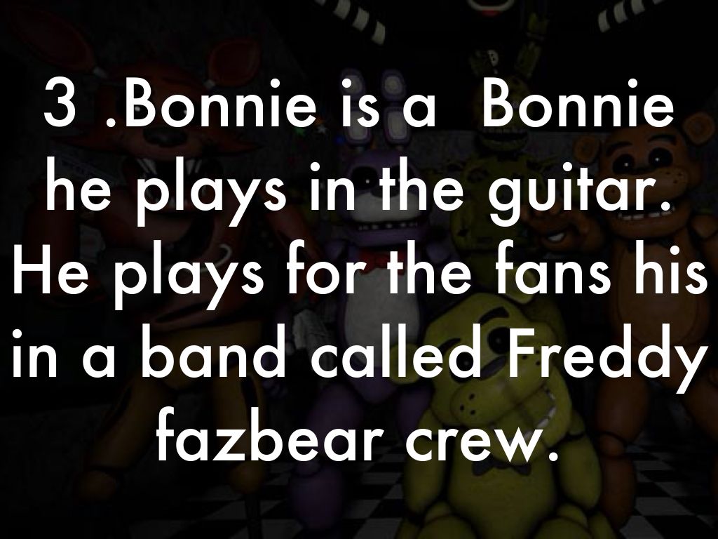 3 .Bonnie is a Bonnie he plays in the guitar. He plays for the fans his in a band called Freddy fazbear crew.
