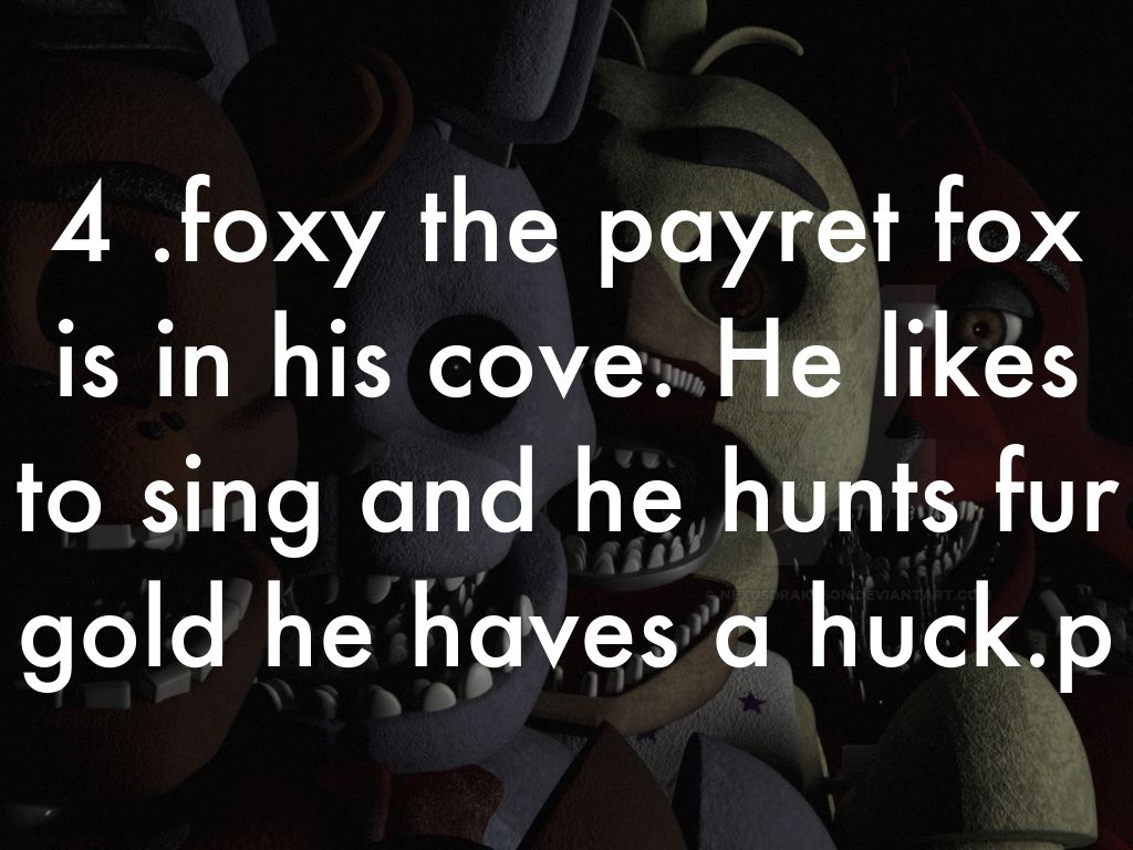 4 .foxy the payret fox is in his cove. He likes to sing and he hunts fur gold he haves a huck.
