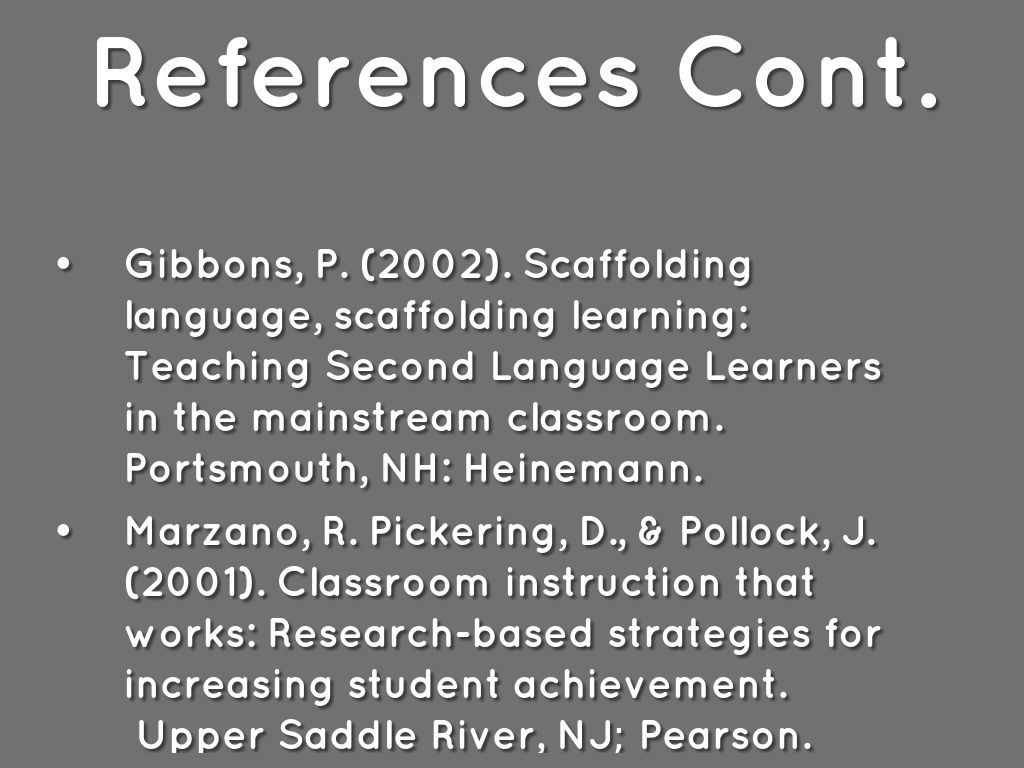 Gibbons, P. (2002). Scaffolding language, scaffolding learning: Teaching Second Language Learners in the mainstream classroom. Portsmouth, NH: Heinemann.