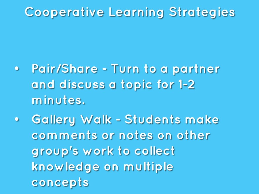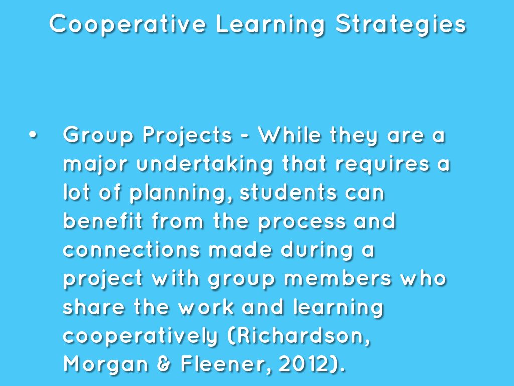 Group Projects - While they are a major undertaking that requires a lot of planning, students can benefit from the process and connections made during a project with group members who share the work and learning cooperatively (Richardson, Morgan & Fleener, 2012).
