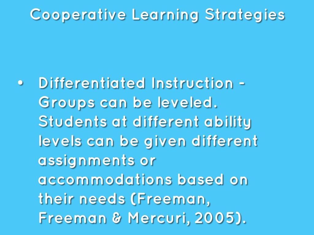 Differentiated Instruction - Groups can be leveled. Students at different ability levels can be given different assignments or accommodations based on their needs (Freeman, Freeman & Mercuri, 2005).