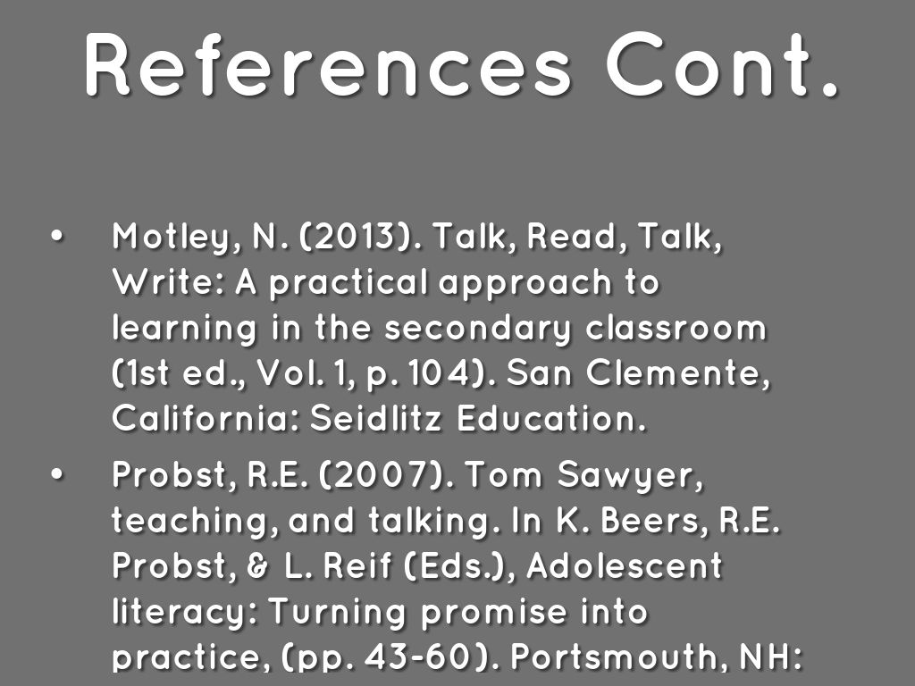 Motley, N. (2013). Talk, Read, Talk, Write: A practical approach to learning in the secondary classroom (1st ed., Vol. 1, p. 104). San Clemente, California: Seidlitz Education.
