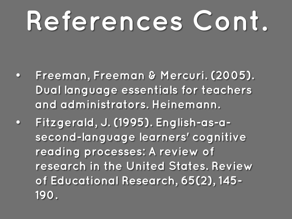 Fitzgerald, J. (1995). English-as-a-second-language learners' cognitive reading processes: A review of research in the United States. Review of Educational Research, 65(2), 145-190.