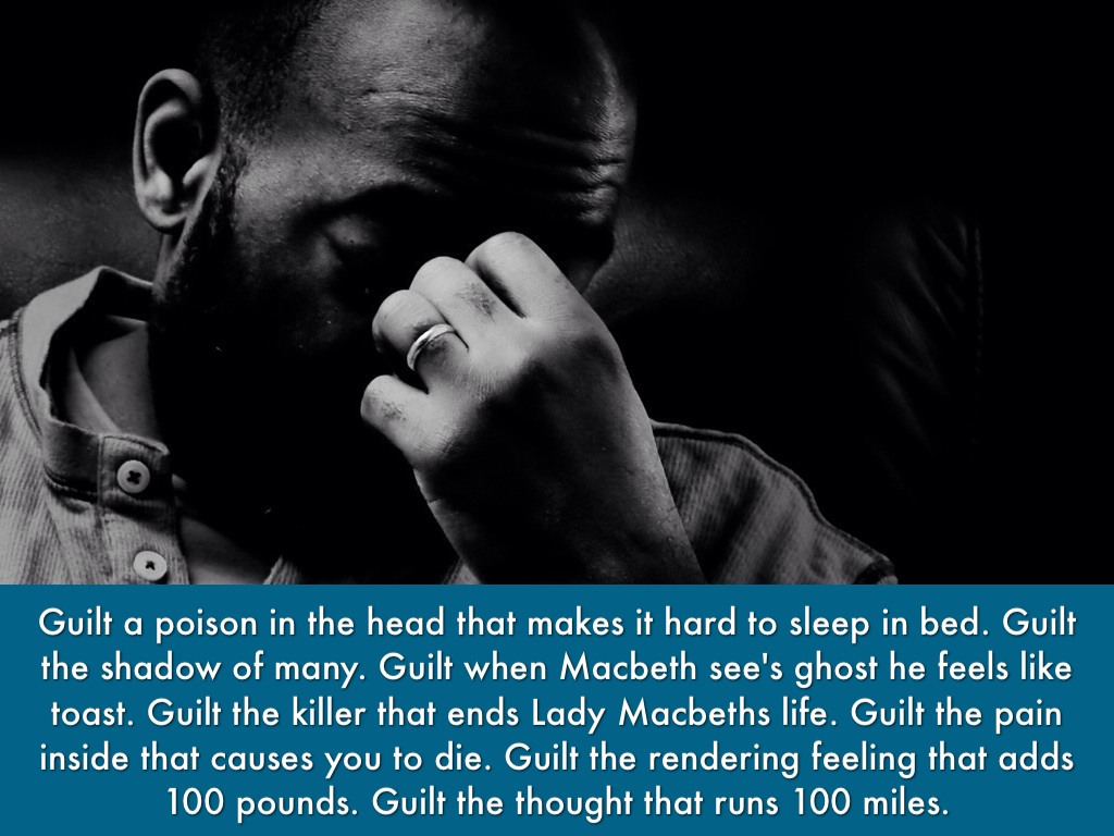 Guilt a poison in the head that makes it hard to sleep in bed. Guilt the shadow of many. Guilt when Macbeth see's ghost he feels like toast. Guilt the killer that ends Lady Macbeths life. Guilt the pain inside that causes you to die. Guilt the rendering feeling that adds 100 pounds. Guilt the thought that runs 100 miles.