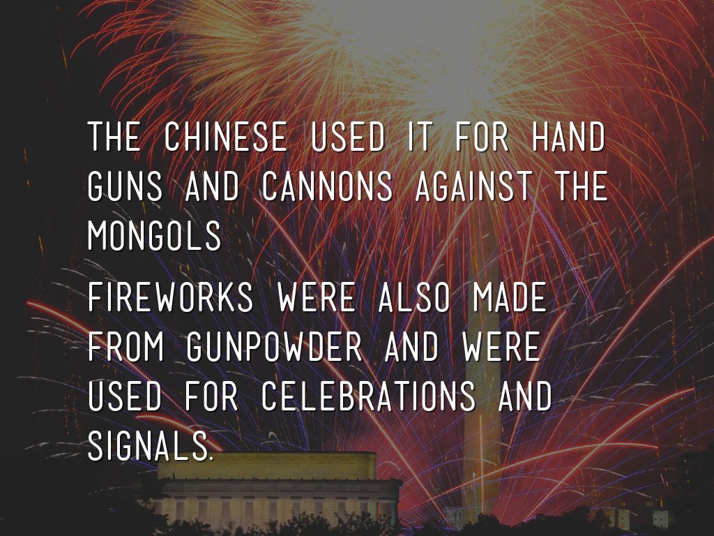 THE CHINESE USED IT FOR HAND GUNS AND CANNONS AGAINST THE MONGOLS