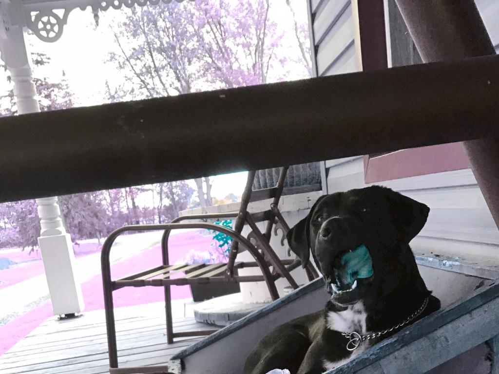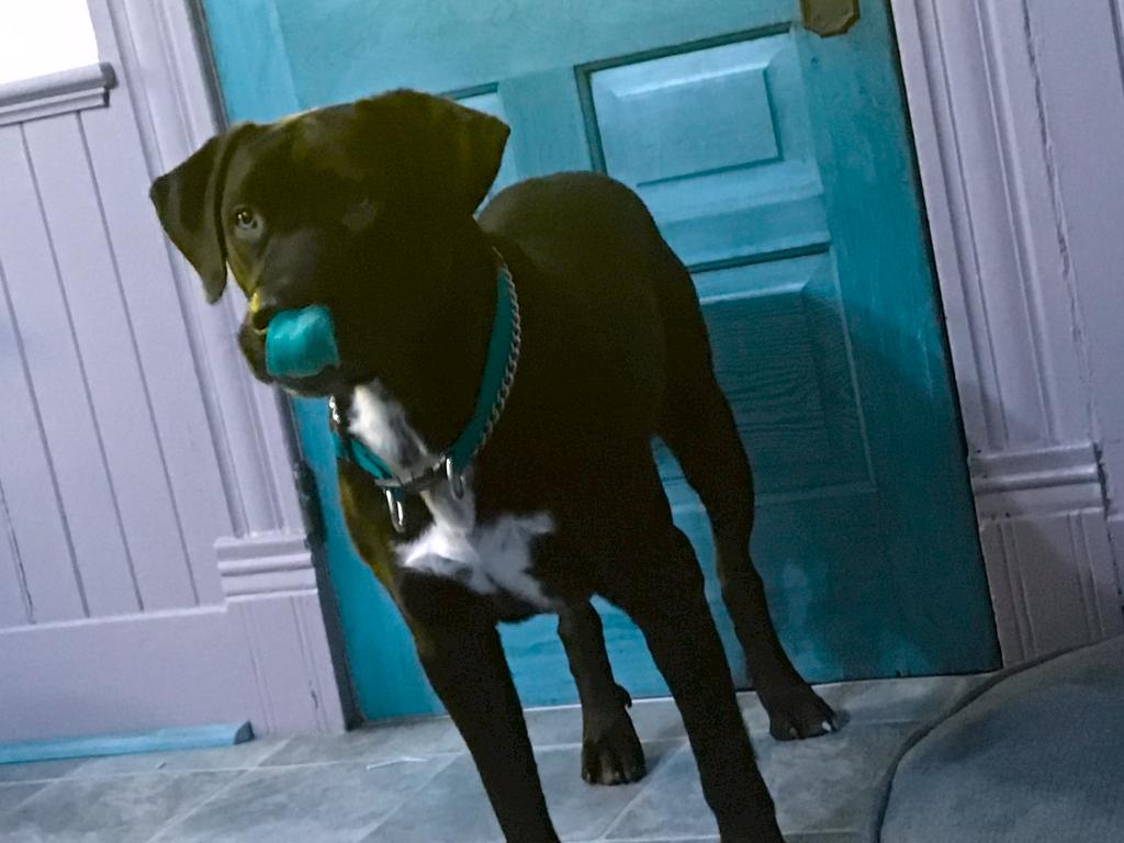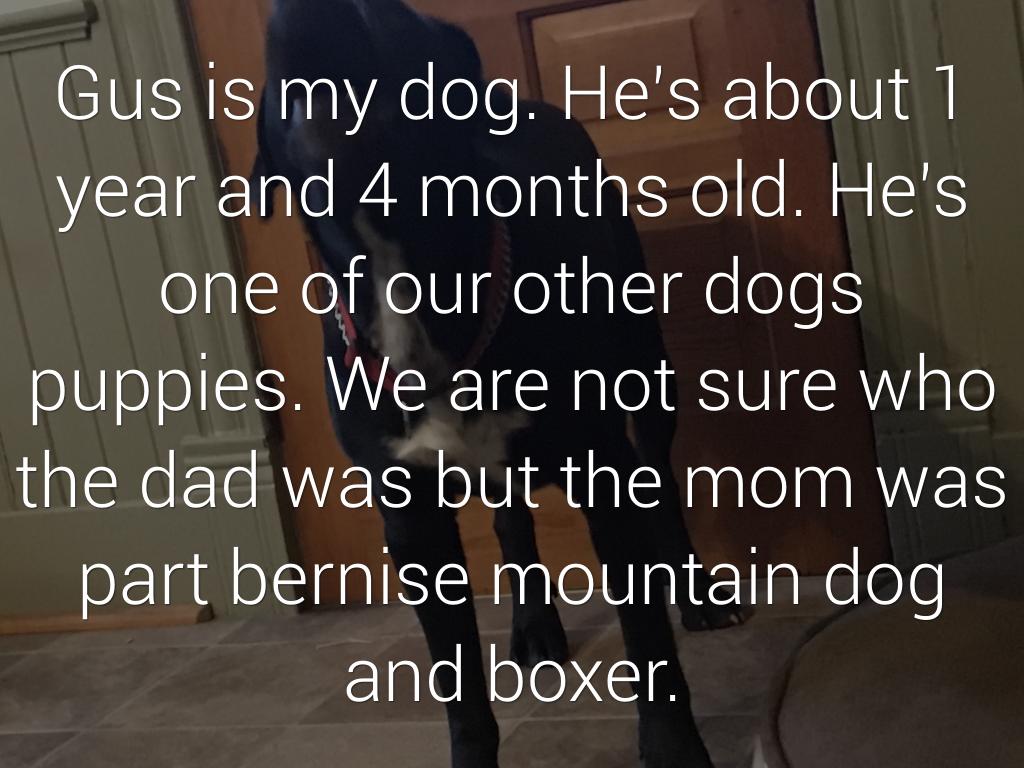Gus is my dog. He’s about 1 year and 4 months old. He’s one of our other dogs puppies. We are not sure who the dad was but the mom was part bernise mountain dog and boxer.