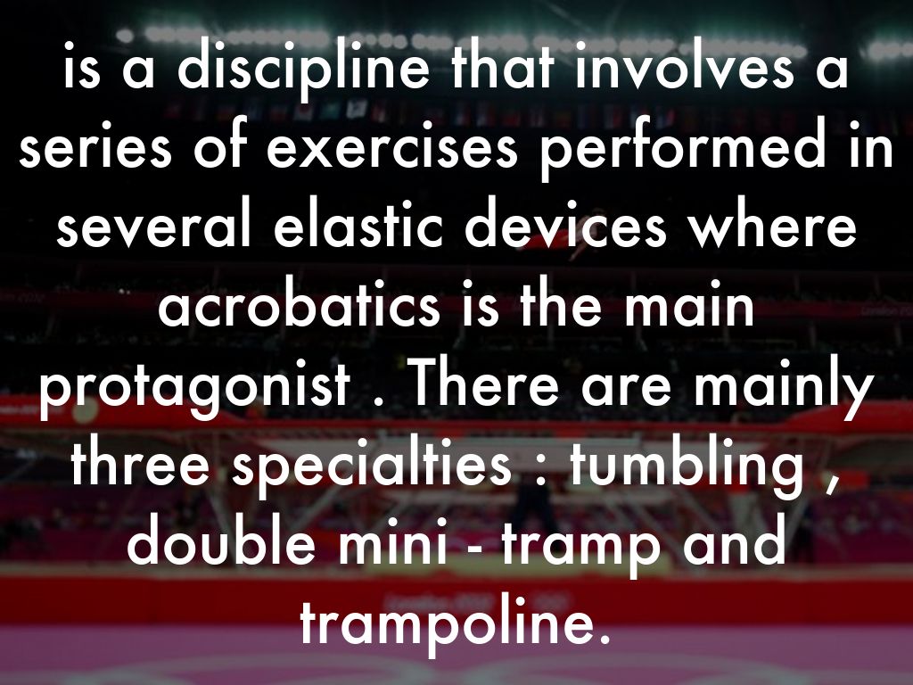is a discipline that involves a series of exercises performed in several elastic devices where acrobatics is the main protagonist . There are mainly three specialties : tumbling , double mini - tramp and trampoline.