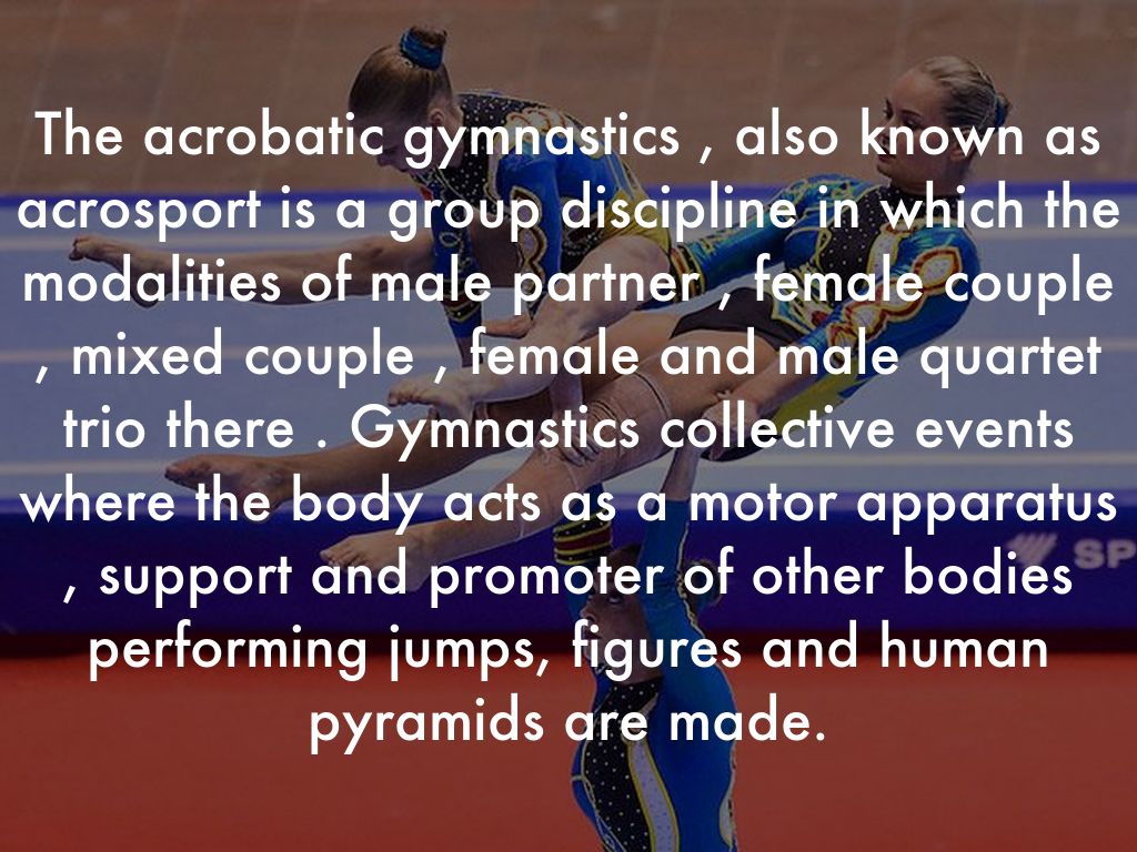 The acrobatic gymnastics , also known as acrosport is a group discipline in which the modalities of male partner , female couple , mixed couple , female and male quartet trio there . Gymnastics collective events where the body acts as a motor apparatus , support and promoter of other bodies performing jumps, figures and human pyramids are made.