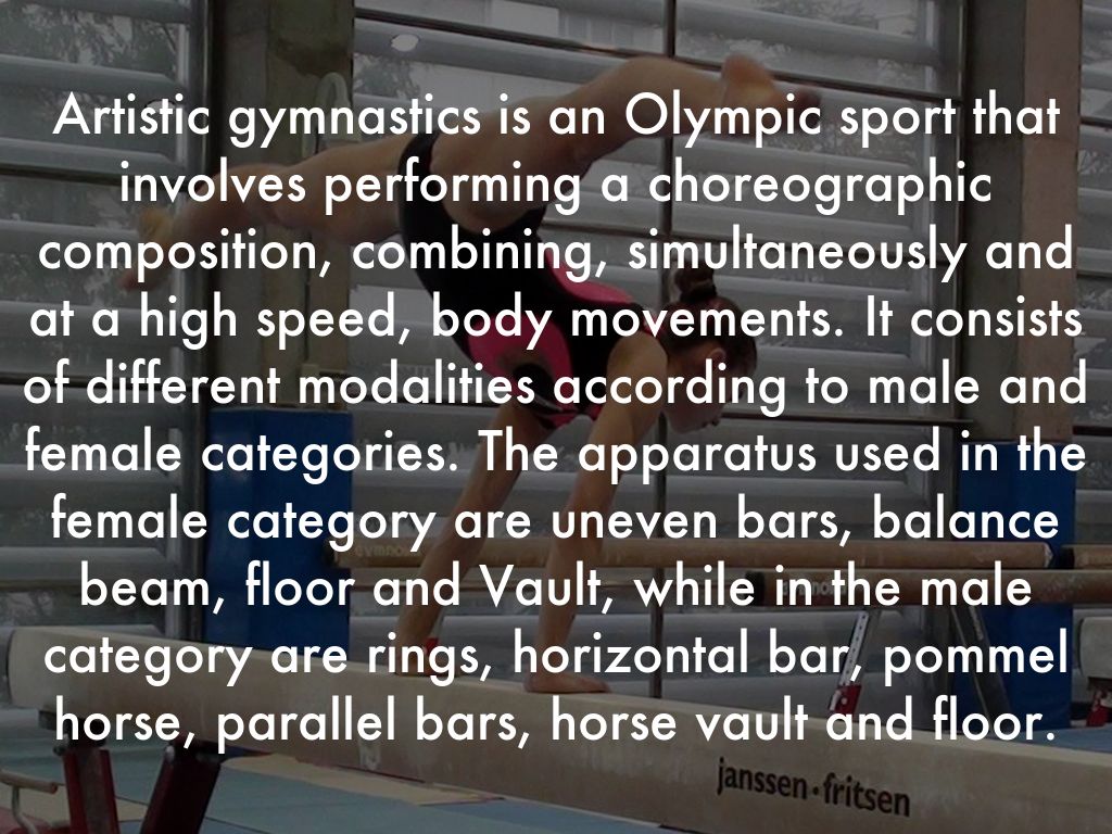 Artistic gymnastics is an Olympic sport that involves performing a choreographic composition, combining, simultaneously and at a high speed, body movements. It consists of different modalities according to male and female categories. The apparatus used in the female category are uneven bars, balance beam, floor and Vault, while in the male category are rings, horizontal bar, pommel horse, parallel bars, horse vault and floor.
