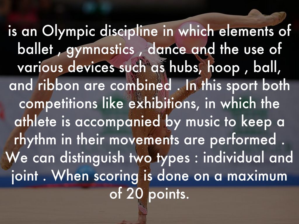is an Olympic discipline in which elements of ballet , gymnastics , dance and the use of various devices such as hubs, hoop , ball, and ribbon are combined . In this sport both competitions like exhibitions, in which the athlete is accompanied by music to keep a rhythm in their movements are performed . We can distinguish two types : individual and joint . When scoring is done on a maximum of 20 points.
