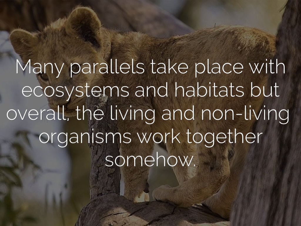 Many parallels take place with ecosystems and habitats but overall, the living and non-living organisms work together somehow.