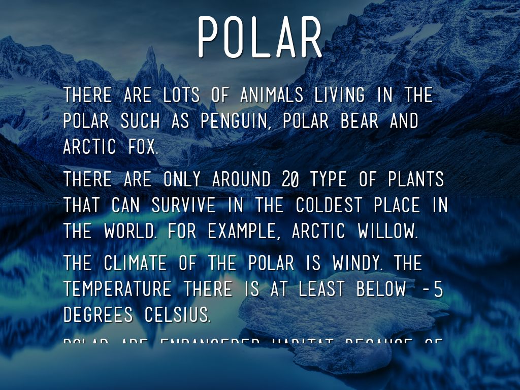 The climate of the Polar is windy. The temperature there is at least below -5 degrees Celsius.