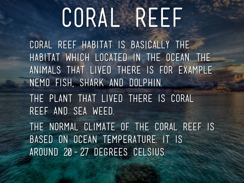 Coral reef habitat is basically the habitat which located in the ocean. The animals that lived there is for example Nemo fish, Shark and Dolphin.