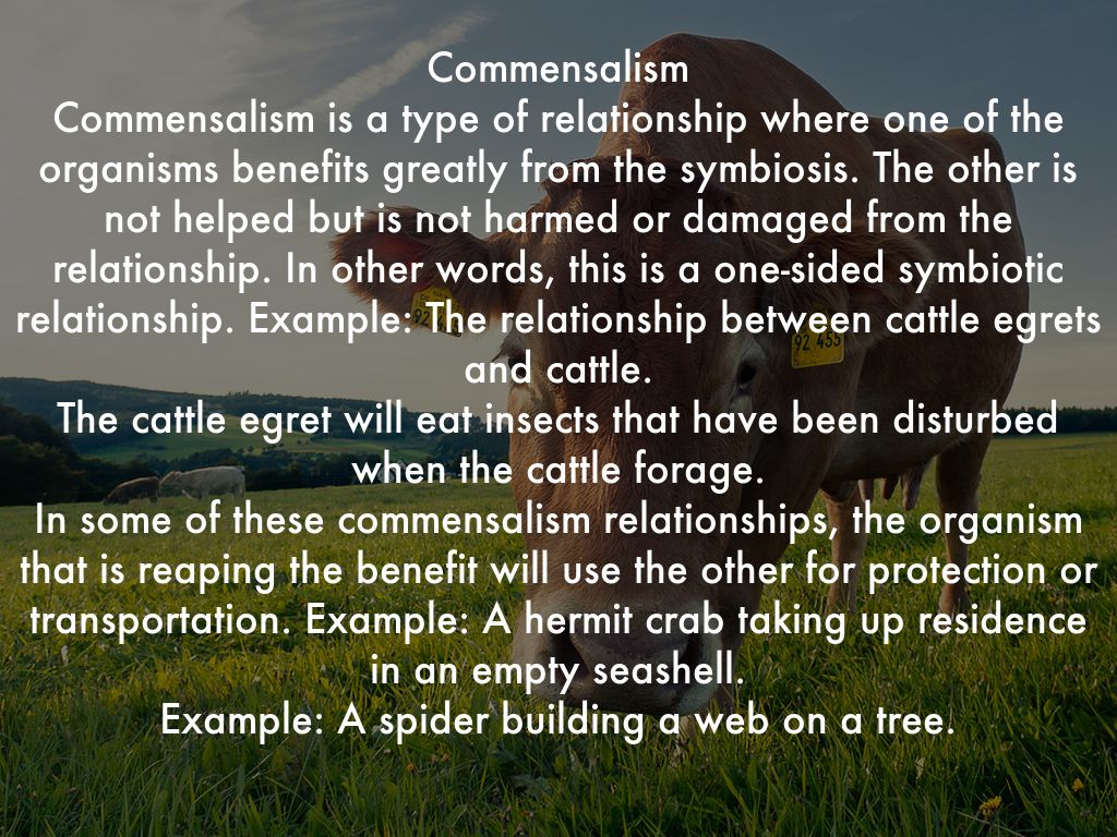 Commensalism Commensalism is a type of relationship where one of the organisms benefits greatly from the symbiosis. The other is not helped but is not harmed or damaged from the relationship. In other words, this is a one-sided symbiotic relationship. Example: The relationship between cattle egrets and cattle. The cattle egret will eat insects that have been disturbed when the cattle forage. In some of these commensalism relationships, the organism that is reaping the benefit will use the other for protection or transportation. Example: A hermit crab taking up residence in an empty seashell. Example: A spider building a web on a tree.