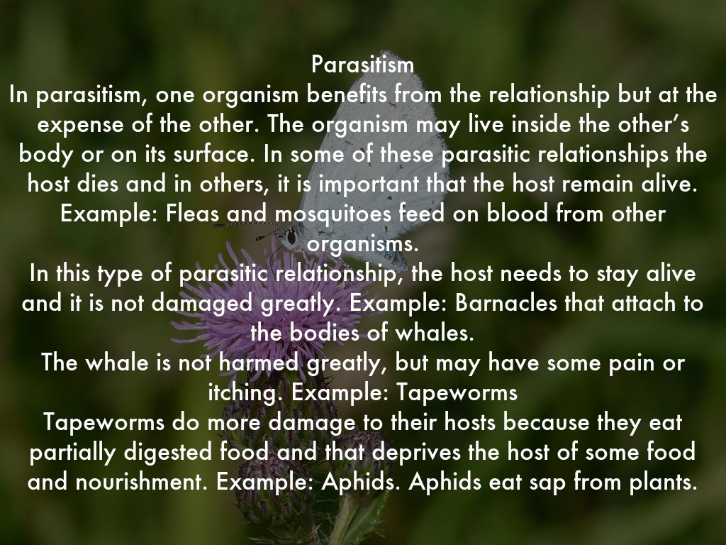 Parasitism In parasitism, one organism benefits from the relationship but at the expense of the other. The organism may live inside the other’s body or on its surface. In some of these parasitic relationships the host dies and in others, it is important that the host remain alive. Example: Fleas and mosquitoes feed on blood from other organisms. In this type of parasitic relationship, the host needs to stay alive and it is not damaged greatly. Example: Barnacles that attach to the bodies of whales. The whale is not harmed greatly, but may have some pain or itching. Example: Tapeworms Tapeworms do more damage to their hosts because they eat partially digested food and that deprives the host of some food and nourishment. Example: Aphids. Aphids eat sap from plants.