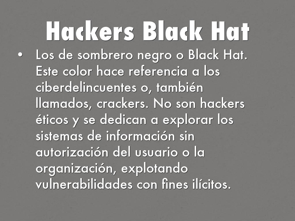 Los de sombrero negro o Black Hat. Este color hace referencia a los ciberdelincuentes o, también llamados, crackers. No son hackers éticos y se dedican a explorar los sistemas de información sin autorización del usuario o la organización, explotando vulnerabilidades con fines ilícitos.