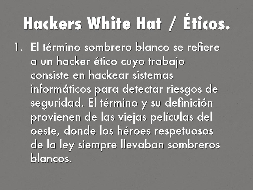 El término sombrero blanco se refiere a un hacker ético cuyo trabajo consiste en hackear sistemas informáticos para detectar riesgos de seguridad. El término y su definición provienen de las viejas películas del oeste, donde los héroes respetuosos de la ley siempre llevaban sombreros blancos.