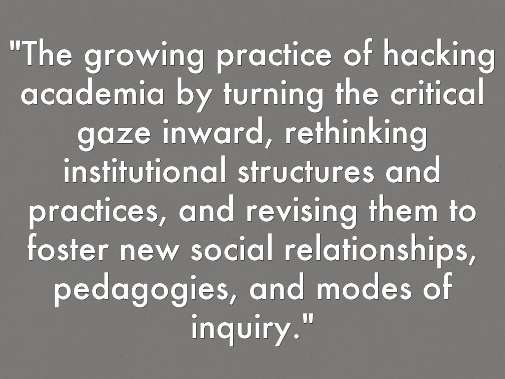 "The growing practice of hacking academia by turning the critical gaze inward, rethinking institutional structures and practices, and revising them to foster new social relationships, pedagogies, and modes of inquiry."